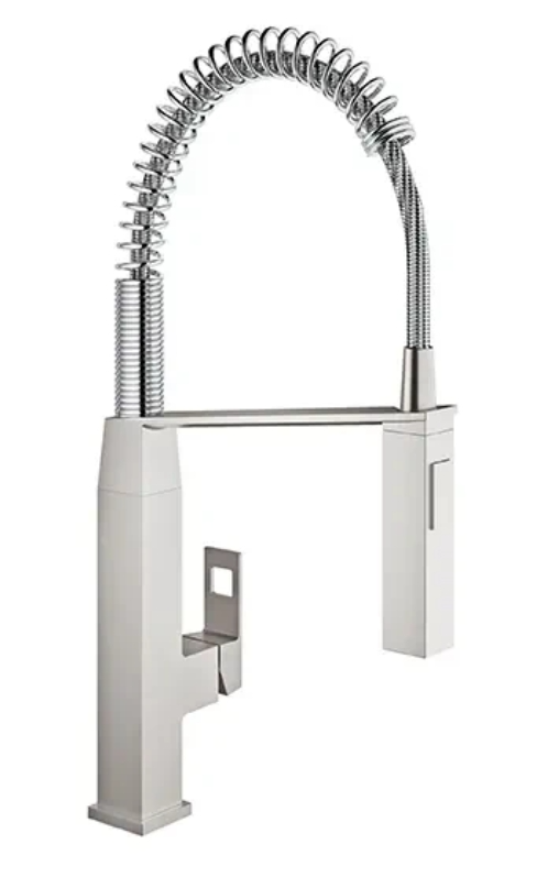 The GROHE Eurocube Semi-Pro Dual Spray Kitchen Faucet adds architectural appeal with its precise geometric lines and commanding presence. Offering semi-pro performance, the Eurocube faucet features a flexible coil spring arm with full, 360-degree rotation, dual function spray head, and a docking arm that keeps the spray head in place when not in use.Read More