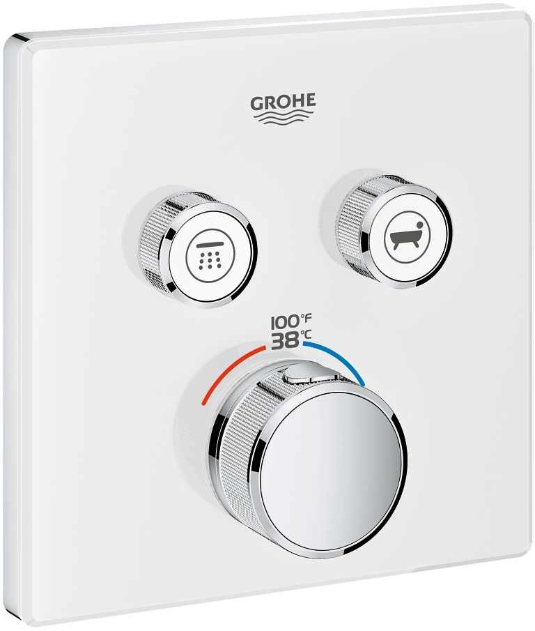 Choose a thermostat that is as flexible as possible for your most enjoyable shower or bath ever. Packed with useful features, the Grohtherm SmartControl concealed thermostat features a minimalist design and stylish Moon White that will enhance any modern bathroom. The innovative SmartControl technology allows you to select your desired spray source and adjust the water volume at the push-turn of a button. The three valves offer total flexibility, whatever your shower set up – you can control, switch between or even combine different spray patterns and water outlets – perfect for spaces where you want to have hand, head and side showers, as well as a bath. Integrated GROHE TurboStat technology prevents any unpleasant temperature fluctuations. GROHE EasyLogic markings and textured buttons with exchangeable symbols make it easy and intuitive to use. Family-friendly, the GROHE SafeStop override button allows you to set a maximum temperature of 100° F/38° C to prevent scalding. Water-saving GROHE EcoJoy technology gives you the option of a reduced flow rate with no compromise on enjoyment. Thanks to the GROHE QuickFix system it’s swift and straightforward to install. The slim profile makes it easy to keep clean, and the chic, durable GROHE StarLight Moon finish will look pristine for years to come. With a slim, round design perfect for that minimalist, streamlined look, this product is bound to enhance your bathroom scheme. Please note that this product must be installed in combination with the GROHE Rapido SmartBox (35601000).