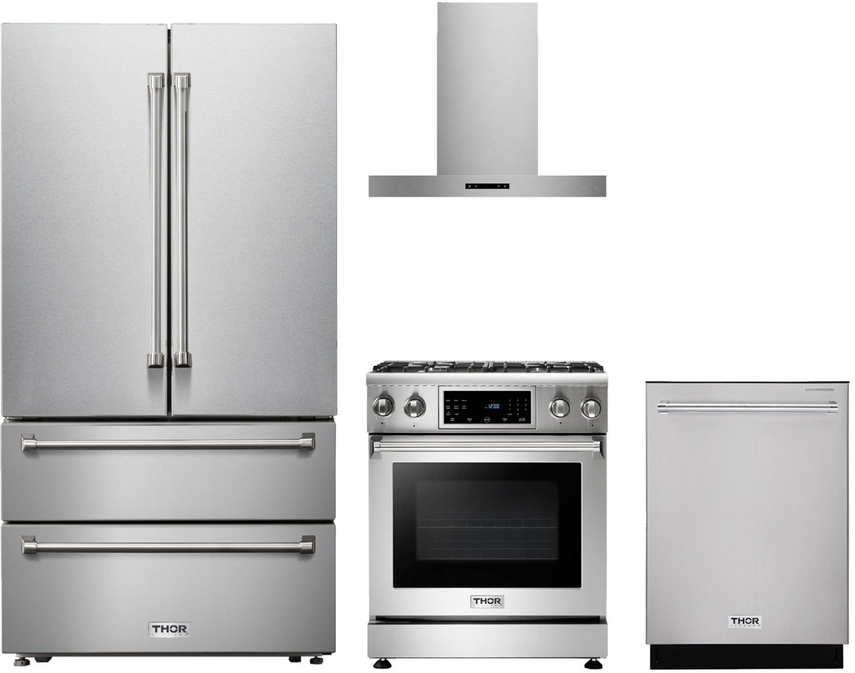 Thor Kitchen® 4 Piece Stainless Steel Kitchen Package with a freestanding gas range, French door refrigerator, built in dishwasher and wall mounted range hood.Read More